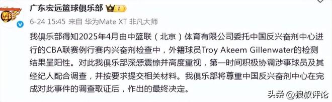 广东宏远官方回应表示:外籍球员Troy Akeem Gillenwater的检测结果呈阳性。对此我俱乐部深感震惊并高度重视,第一时间积极协调涉事球员及其经纪人配合调查,并按要求提交相关材料。我俱乐部将尊重中国反兴奋剂中心在完成对此事件的调查取证后,作出的最终决定。