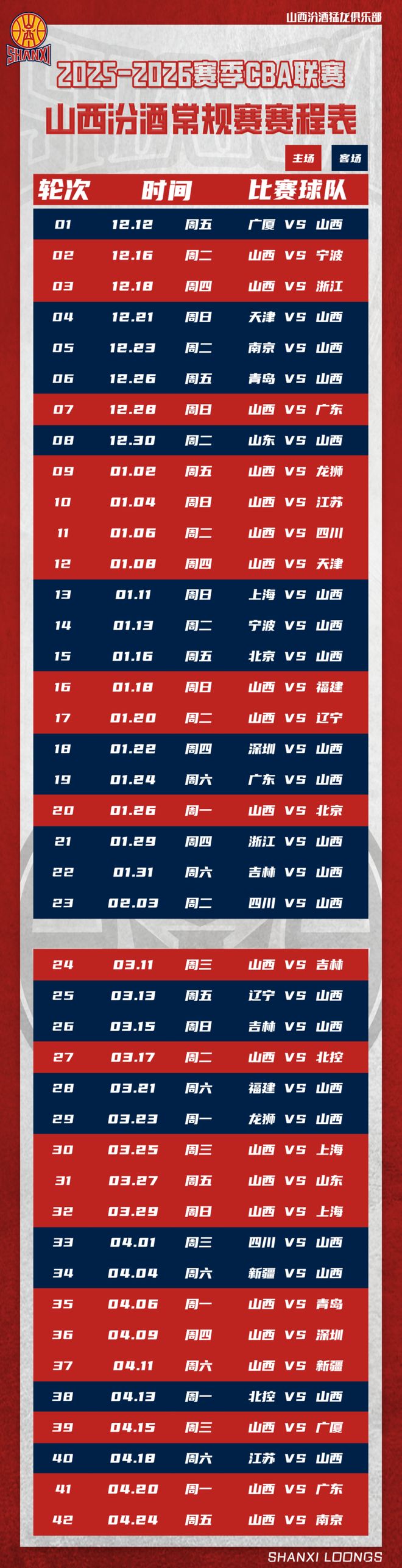 20252026赛季CBA联赛山西汾酒男篮赛程发布