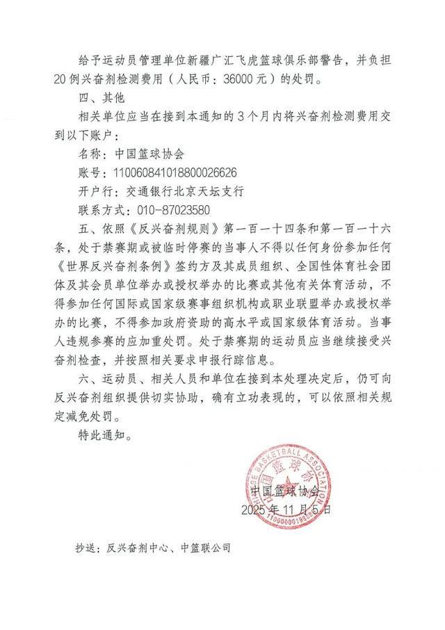 中国篮球协会发布通知,在2024-2025赛季CBA联赛赛内兴奋剂检查中,前新疆男篮运动员哈雷尔的A样本检测呈大麻酚类阳性,且其放弃检测B样本,违规成立。依据相关规定,给予该运动员禁赛3个月(2025年11月5日至2026年2月4日)的处罚;给予俱乐部医疗与反兴奋剂负责人吴杰警告处罚;给予新疆男篮警告,并令其承担20例兴奋剂检测费用36000元。同时明确了禁赛期相关限制及费用缴纳等其他事项。