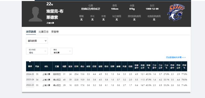 布莱德索首次登陆CBA是在22-23赛季,当时加盟到了上海男篮。截至上赛季,他已累计征战CBA三个赛季,一直效力于上海队,赛季最好数据诞生在22-23赛季,场均可砍下17.6分5.8篮板6.1助攻。