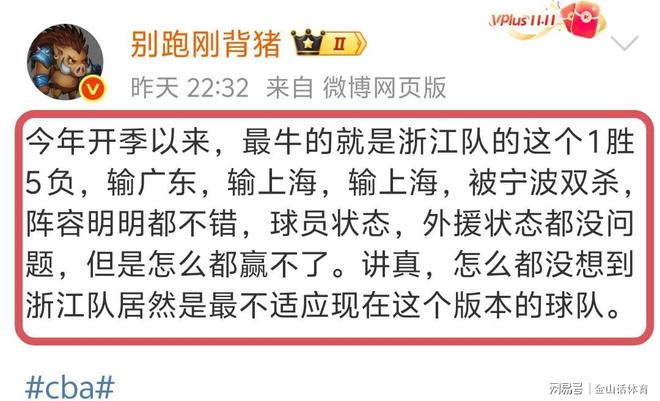 赛后,媒体人别跑刚背猪社媒发文点评了浙江男篮本赛季的表现:“今年开季以来,最牛的就是浙江队的这个1胜5负,输,输上海,输上海,被宁波双杀,阵容明明都不错,球员状态,外援状态都没问题,但是怎么都赢不了。”。