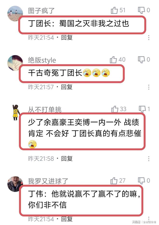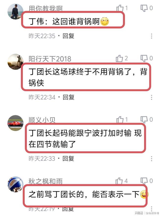 “丁伟:这回谁背锅啊”;“丁团长这场球终于不用背锅了,背锅侠”;“丁团长起码能跟宁波打加时输 现在四节就输了”;“之前骂丁团长的,能否表示一下。”;“原来丁团长最冤枉”;“没有丁团长,只能更惨”……