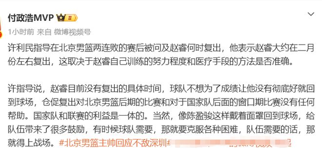 据媒体人付政浩的报道:许指导说赵睿大概会在2月份复出,这主要取决于赵睿自己训练的努力程度和医疗手段的方法是否准确,赵睿目前没有复出的具体时间,球队不想为了成就让他没有彻底伤好就回归,仓促复出对北京男篮后期的比赛和对于国家队后面的窗口期比赛没有任何帮助。国家队和联赛的利益是一体的。
