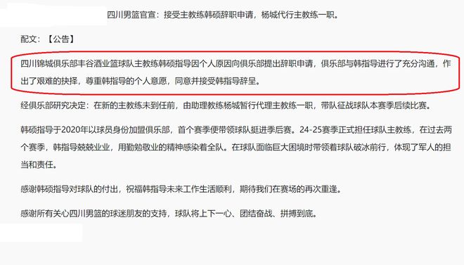 值得一提的是,在刚刚,CBA本赛季第六个下课的主教练也是产生了,他就是四川队主教练韩硕,根据四川队公布的内容,此番韩硕下课,是他本人主动申请辞职,随后,四川队也是与韩硕进行了充分地沟通,最终,做出了一个无奈的选择,尊重韩指导的个人意愿,同意了他的辞职。