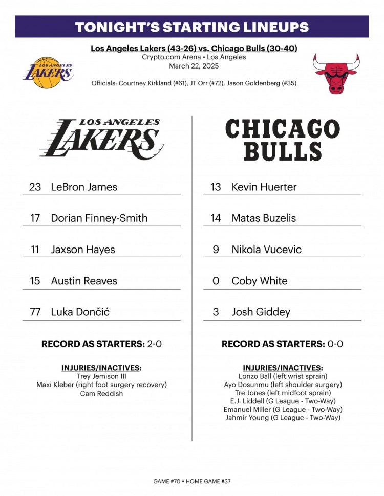 3月23日讯 上午10点半,湖人主场迎战公牛。此役,詹姆斯与八村塁复出,东契奇、里夫斯、范德彪、电风扇、文森特等人均可出战。值得注意的是,除了受伤的克莱伯,雷迪什和双向合同球员