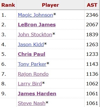 4月20日讯 NBA季后赛快船VS掘金,哈登已经送出了2次助攻。到目前为止,哈登季后赛生涯助攻数来到1063次,超越拉里-伯德,上升至NBA历史第八位,排在他前面的是隆多。