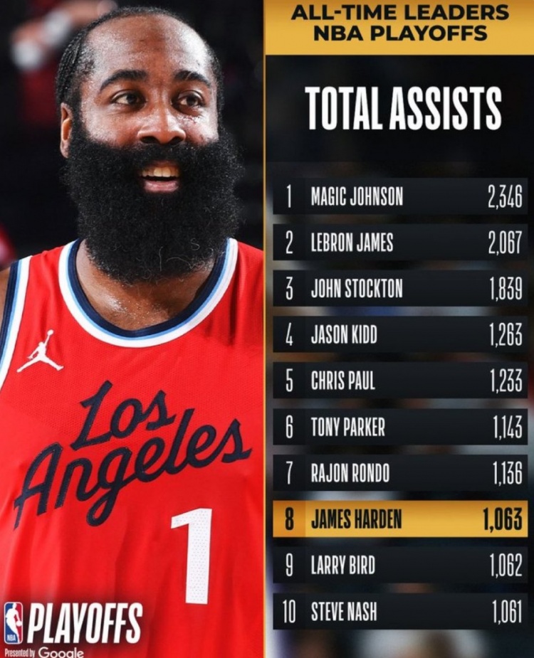 到目前为止,哈登季后赛生涯助攻数来到1063次,超越拉里-伯德,上升至NBA历史第八位,排在他前面的是隆多。