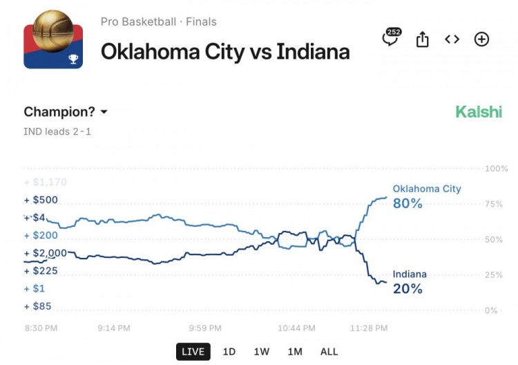 6月14日讯 NBA总决赛G4,雷霆客场111-104力克步行者,总比分扳成2-2。美国金融交易和预测市场平台Kalshi晒出本场过后的总冠军概率,雷霆升至80%,步行者为20%。双方的天王山之战将