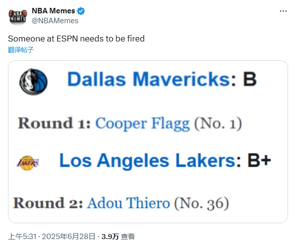 06月29日讯 今日ESPN官网发布了2025NBA选秀大会各队评级,其中独行侠状元选中库珀-弗拉格评级为B,湖人36顺位选中阿杜-蒂耶罗评级为B+。对此,美媒NBA Memes分享图片,并配文:“ESPN