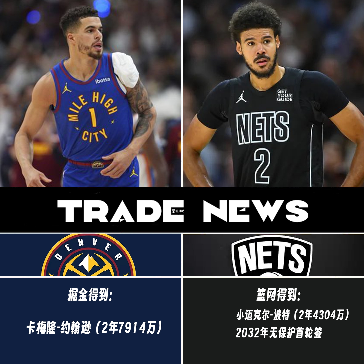 Shams:掘金将小波特+32年无保护首轮送至篮网换回卡梅隆约翰逊