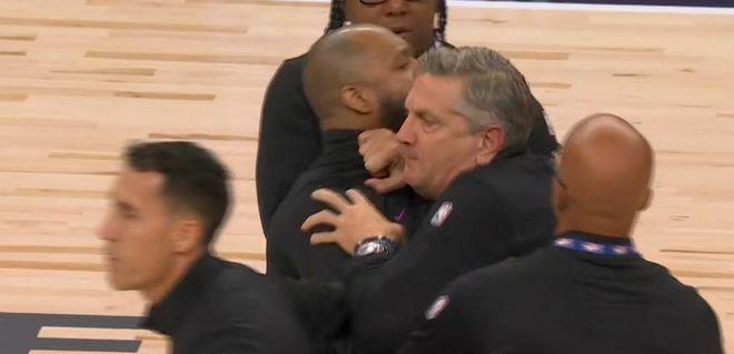 比赛都毫无悬念了,不过,诧异的是,最后时刻,波斯特和英格尔斯卡位互相推搡,差点还打起来了