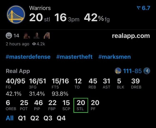 勇士今天抢疯了,全队20次抢断,创本赛季至今所有比赛抢断纪录,库里和波姐都有4次,森林狼似乎笼罩着无心恋战的阴影,全队多达25次失误,华子一人就失误8次之多。