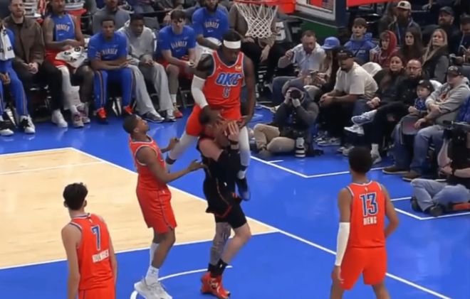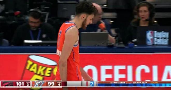 最后30秒,雷霆关键一攻,切特单打巴恩斯,突破急停跳投惨遭迎面大帽
