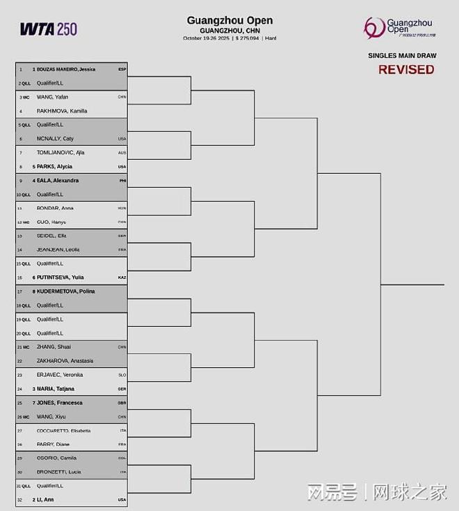 我们再来关注本周赛事。北京时间昨晚,WTA250广州国际女子网球公开赛官宣了正赛签表。马内罗、安-李、玛利亚、伊埃拉作为前四号种子出战。中国有四朵金花参赛,首轮对阵如下:王雅繁 vs 拉克西莫娃、郭涵煜 vs 邦达尔、张帅 vs 扎哈洛娃、王曦雨 vs 琼斯。