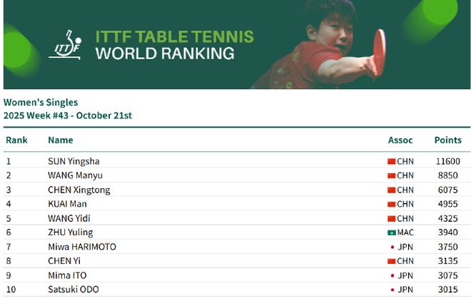 据央视新闻消息,10月21日,国际乒联公布2025年第43周排名:女单方面,孙颖莎11600分连续第171周霸榜第一,王曼昱8850分排名第二,陈幸同6075分排名第三。