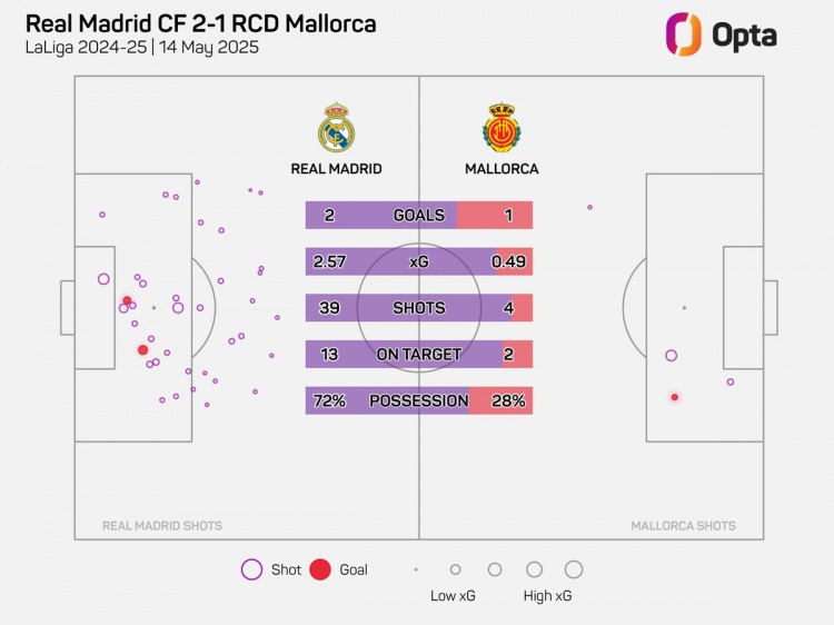 皇马对阵马洛卡射门39次,创造本队0304赛季以来西甲主场纪录