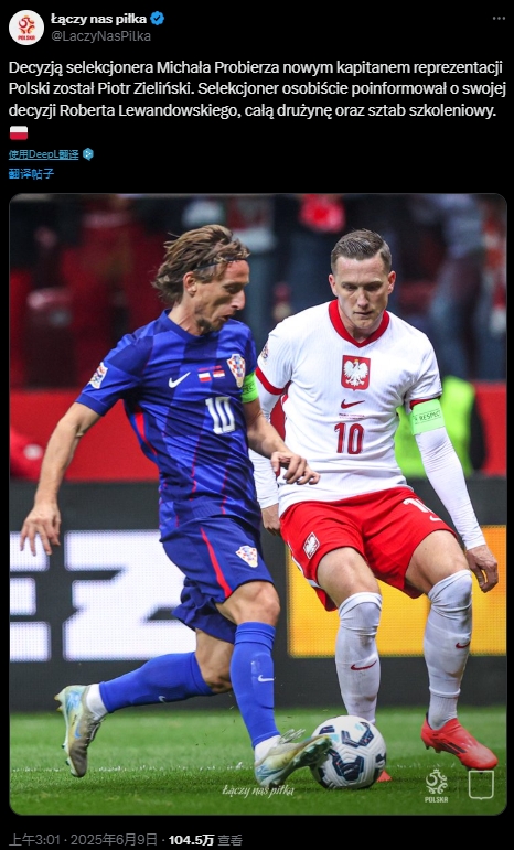 就在莱万发布声明前不到一小时,波兰队也发布了一项官方公告,公告中表示国家队队长更换为泽林斯基。