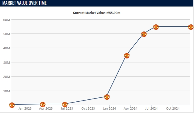 得益于上赛季的出色表现,梅努的身价在上半年暴涨,去年12月他的德转身价还只有600万欧,而目前他的身价已经来到了5500万欧。