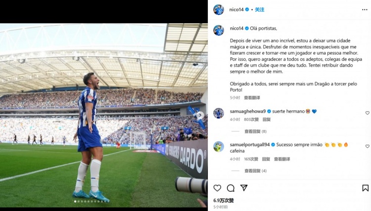 尼科-冈萨雷斯表示:“波尔图球迷们,大家好。经历了不可思议的一年之后,我将离开这座神奇而独特的城市。我经历了很多难忘的时刻,在场上场下都变得更为成熟。”