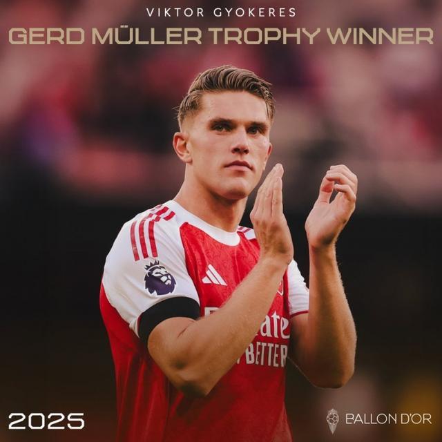 9月23日讯 阿森纳官方发布海报,祝贺约克雷斯获得2025年盖德-穆勒奖,也就是年度最佳前锋奖。