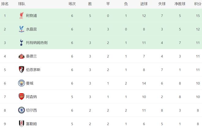 在积分榜上,利物浦依然排名榜首,5胜1负拿到15分。排名第2的是大黑马水晶宫。水晶宫3胜3平,拿到12分。水晶宫是唯一不败战绩的球队,让人惊讶。热刺、桑德兰和伯恩茅斯都是11分,排名第3到第5。曼城3胜1平2负,拿到10分,排名第6。阿森纳也是10分,排名第7。第8 的是8分的切尔西。曼联2胜1平3负,只拿到7分,排名掉到第14。