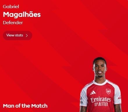 赛后,加布里埃尔被英超官方评为全场最佳球员,他的得票率高达67%。本场比赛,除了绝杀进球外,加布里埃尔3抢断、3拦截和7次成功争顶均为全场最高。