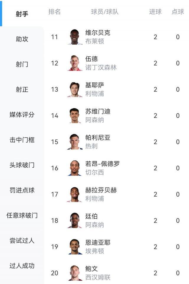 09月29日讯 除了明天凌晨埃弗顿vs西汉姆的比赛,英超前6轮其余比赛均已结束。英超射手榜方面,哈兰德轰入8球断层领跑,杰顿-安东尼、塞梅尼奥和伊戈尔·蒂亚戈4球位列第二,埃基蒂克、约克雷斯、恩佐等6名球员打入3球。
