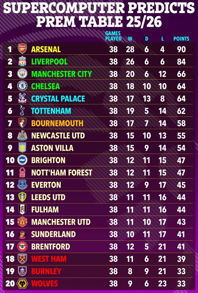 根据超级电脑的预测,阿森纳将以28胜6平4负积90分,获得本赛季的英超冠军,利物浦以6分之差(26胜6平6负积84分)获得亚军。超级电脑预测排在3-6位的则是曼城(20胜6平12负积66分)、切尔西(18胜10平10负积64分)、水晶宫(17胜13平8负积64分)和热刺(19胜5平14负积62分)。
