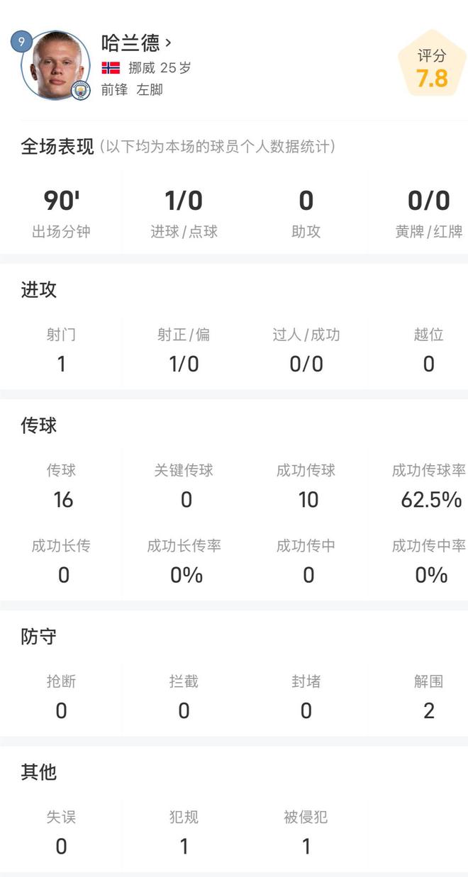 此役哈兰德首发并踢满全场,打入全场唯一进球,全场比赛哈兰德只贡献了1脚射门,就收获进球,16次传球,成功率62.5%,防守端贡献2次解围,赛后机器评分7.8分。