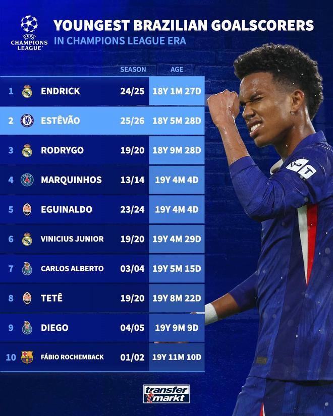 在与阿贾克斯的比赛中斩获欧冠生涯处子球后,18岁的埃斯特旺成为切尔西队史欧冠最年轻进球者,他也是欧冠进球第二年轻的巴西球员,仅次于恩德里克。欧冠进球最年轻的巴西球员1.