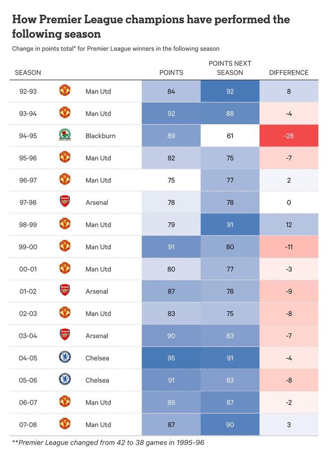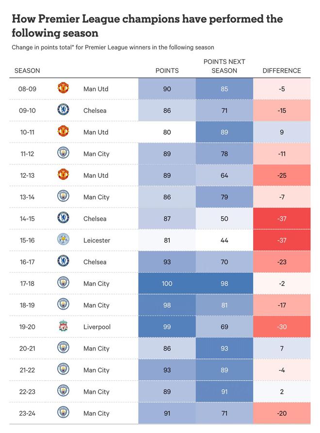 过去15个赛季里,自2010-11赛季安切洛蒂执教的切尔西开始,卫冕冠军球队的积分较上一赛季下滑至少10分的情况出现了9次。