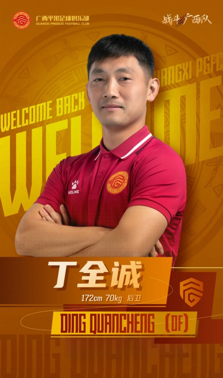 丁全诚,1994年1月8日出生于广西北海,司职后卫,身高172cm;丁全诚的职业生涯曾效力过上海特莱士(上海海港)、广西龙桂达(南通支云)、厦门鹭岛、广西恒宸等球队;在2019-2020赛季、2021至2023赛季曾效力过广西平果FC的前身(广西宝韵、广西平果哈嘹);2018年丁全诚帮助南通支云冲甲成功,又在2021年带领广西平果FC(广西平果哈嘹)冲甲成功,让广西足球时隔27年再次回到中甲联赛的舞台,欢迎回家!
