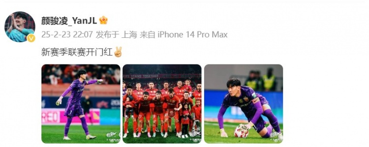 2月23日讯 中超联赛首轮,上海海港主场3-1击败深圳新鹏城。赛后,海港门将颜骏凌发文庆祝胜利。