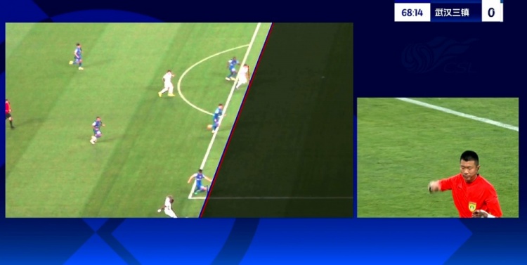 判例三:中超联赛第8轮,上海申花VS武汉三镇,比赛第65分钟,武汉三镇队进球,助理裁判示意越位;裁判员判武汉三镇队越位犯规在先,进球无效;VAR检查并划线后,确认越位。