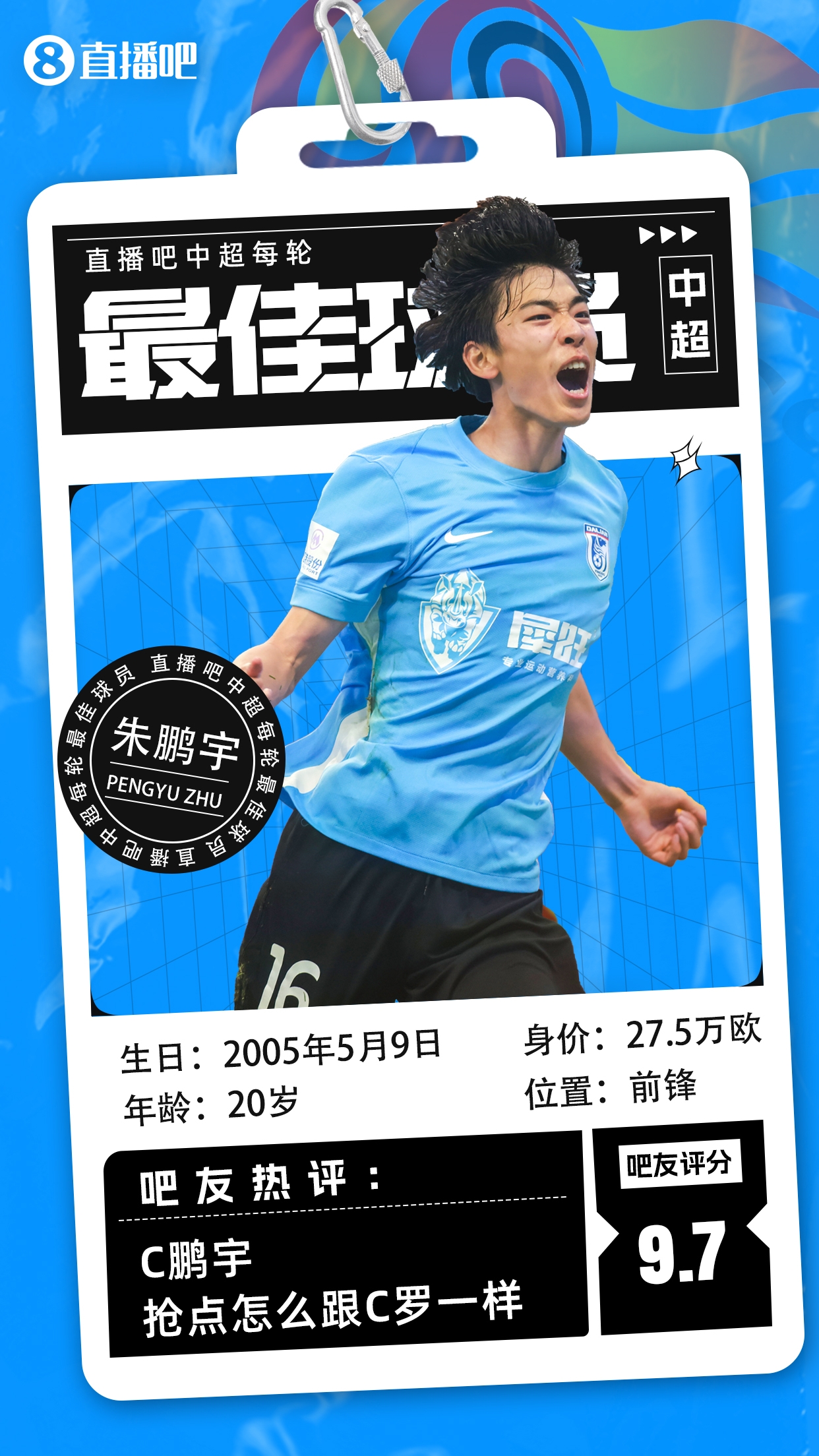 【直播吧】中超第14轮最佳球员:一击制胜!20岁朱鹏宇首次当选