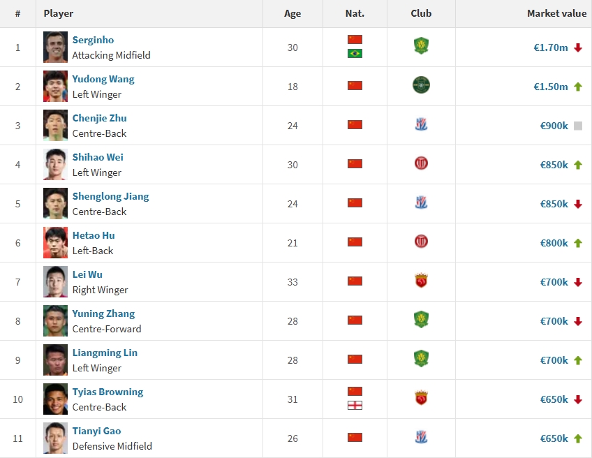 06月19日讯 德国转会市场更新中超球员身价,包括王钰栋、韦世豪、胡荷韬等国脚的身价上涨,新的国脚前十身价如下。(括号内为上一次身价)