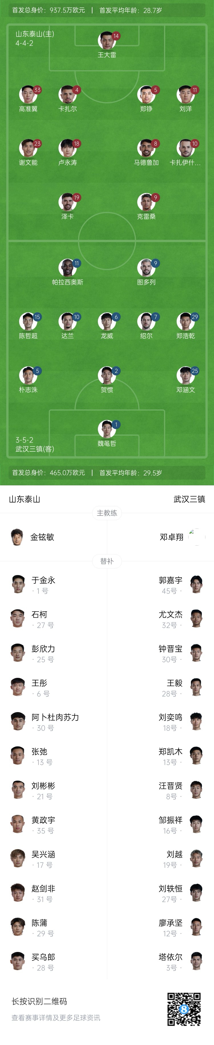 泰山vs三镇首发:泰山5外援齐先发,图多列、帕拉西奥斯出战