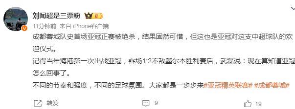 另外一位上海媒体人刘闻超则认为,蓉城遭逆转,也是洲际比赛的一次“欢迎仪式”,“成都蓉城队史首场亚冠正赛被绝杀,结果固然可惜,但这也是亚冠对这支中超球队的欢迎仪式。记得当年海港第一次出战亚冠,客场1:2不敌墨尔本胜利赛后,武磊说:现在算知道亚冠怎么回事了。不同的节奏和强度,不同的足球氛围。大家都是一步步来。”