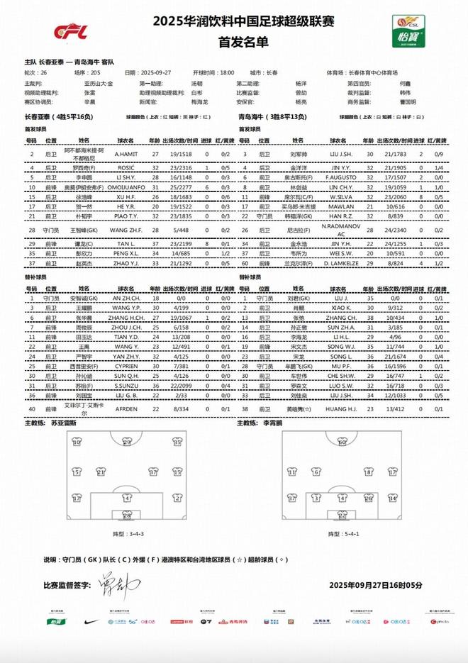 北京时间9月27日18:00,中超联赛第26轮焦点保级战,长春亚泰坐镇主场迎战青岛海牛,赛前双方首发阵容: