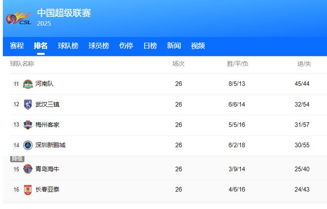 - 25赛季中超26轮赛程过后,排在积分榜最后四位的球队是长春亚泰、青岛海牛、深圳新鹏城、梅州客家。不出意外,本...发表于: 10-13 20:37