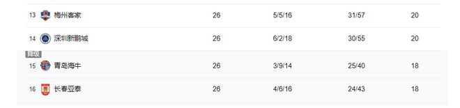 青岛海牛3胜9平14负积18分