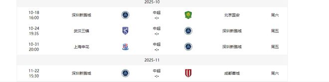 深圳新鹏城2主2客,对手有北京国安(4)、武汉三镇(12)、上海申花(3)、成都蓉城(2)