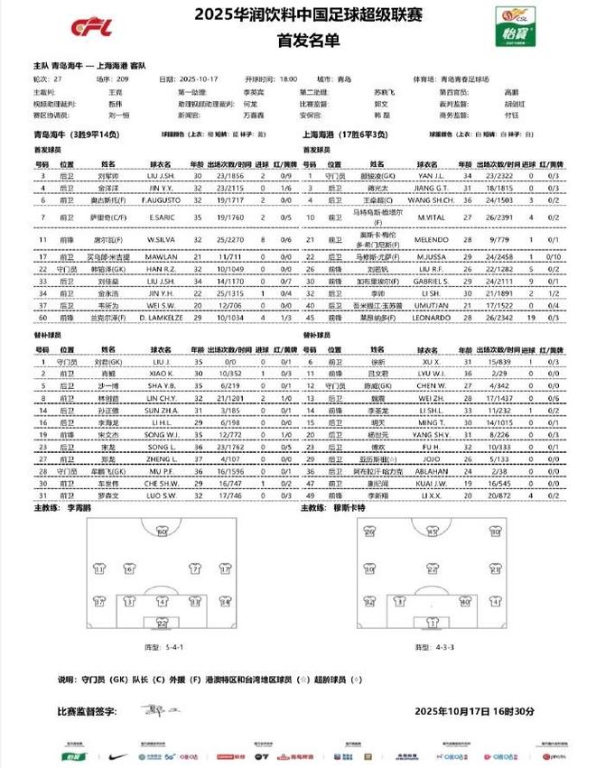 北京时间10月17日18:00,中超第27轮展开争夺,上海海港作客青岛青春足球场挑战青岛海牛,本场主裁判为王竞,VAR裁判为甄伟,赛前双方首发出炉。